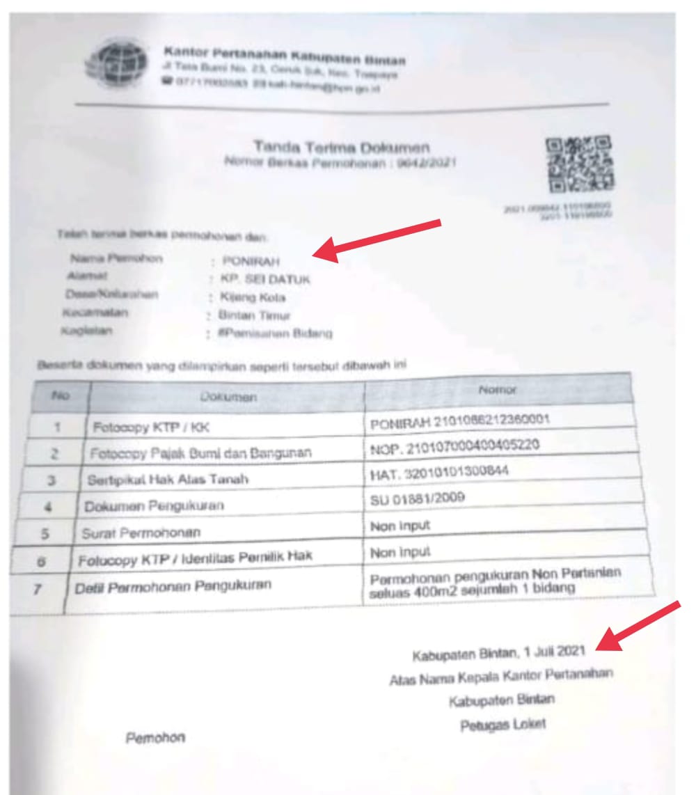 Nur warga Kelurahan Kijang Kota Kecamatan Bintan Timur mengatakan berkas pemisahaan bidang tanah dengan luas 400 M², sejumlah 1 bidang sudah di nyatakan lengkap dan diterima oleh pihak BPN Bintan. Melalui petugas ukur yang bernama Rizky berkas tersebut tidak ada persoalan lagi. Petugas tersebut juga sudah melakukan verifikasi dan pengukuran atas tanah pemohon. Namun hingga kini Sertifikat pengajuan pemisahan bidang atas nama ponirah tidak kunjung selesai. Di konfirmasi Pihak BPN melalui Rizky selalu sibuk dan tidak ada jawaban.