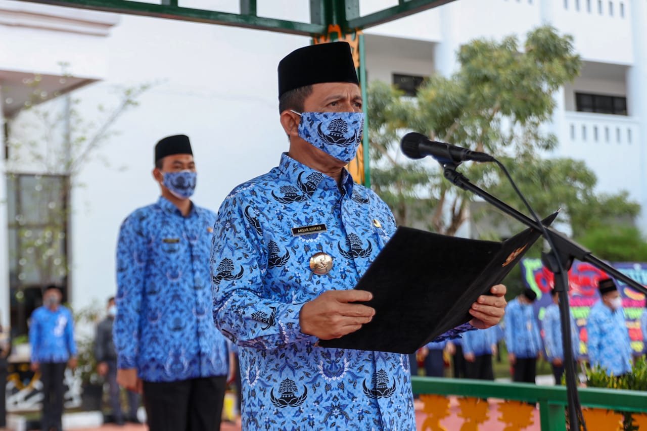 METROBATAM.COM|TANJUNGPINANG –Gubernur Provinsi Kepri H. Ansar Ahmad menjadi inspektur upacara (Irup) Peringatan HUT Korps Pegawai Republik Indonesia (KORPRI) Ke-50 tingkat Provinsi Kepulauan Riau tahun 2021 di lapangan Apel Kantor Gubernur Dompak, Tanjungpinang, Senin (29/11).