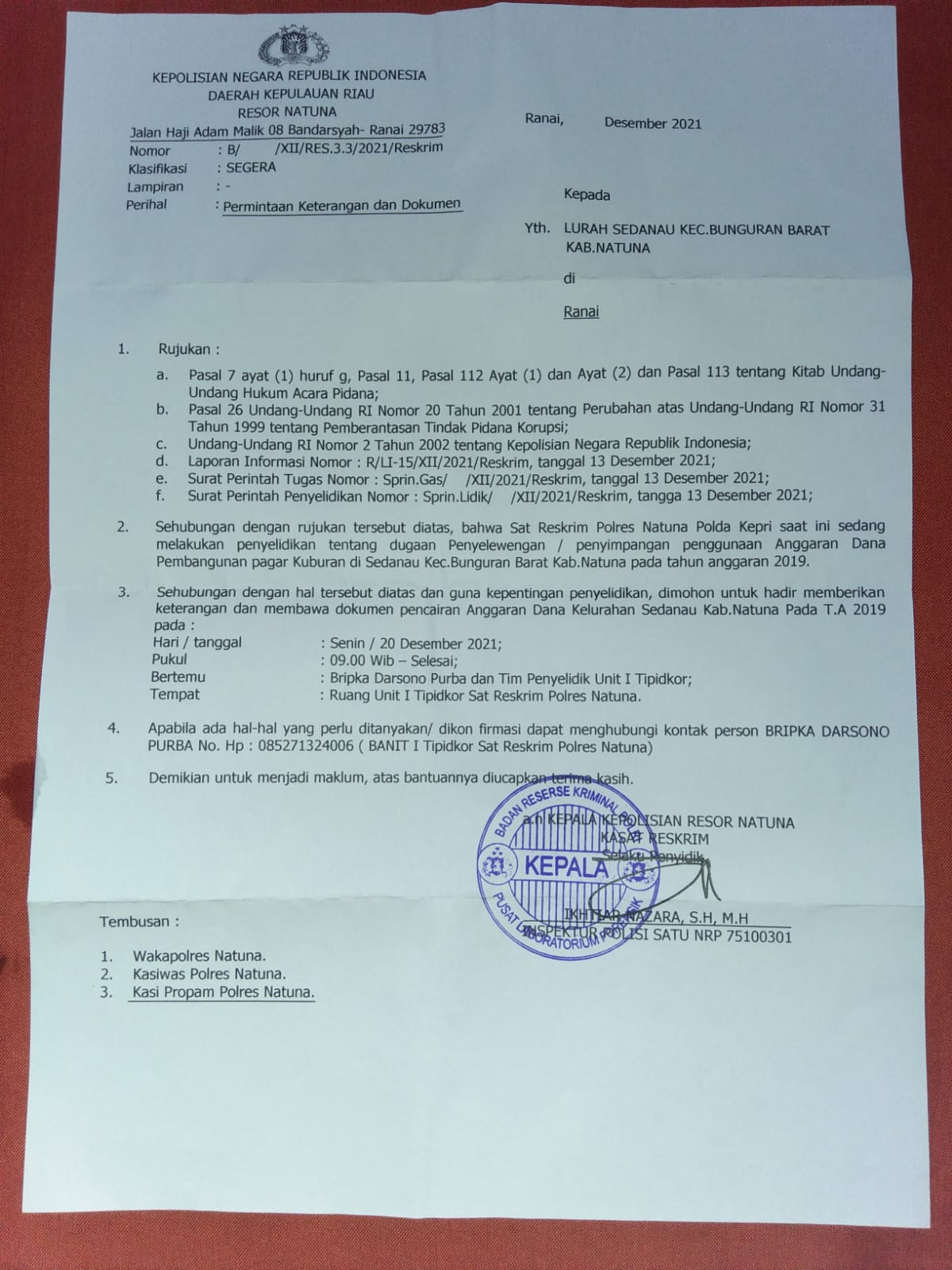 Plt. lurah Sedanau Adi Suharsa S.sos, saat dikonfirmasi Selasa (21/12/21) menyebutkan bahwa benar, pada hari Senin yang lalu tepatnya pada tanggal (20/12/21) ia menerima surat dari Kepolisian Polres Natuna, akan hal pemeriksaan terhadap dirinya, perihal pagar Kuburan yang tumbang di Kelurahan Sedanau Pada tahun 2019, ungkap Adi