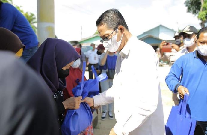 METROBATAM.COM, BATAM – Wakil Wali Kota Batam, Amsakar Achmad, menyerahkan secara simbolis paket sembako murah di Sambau, Nongsa, Rabu (30/3/2022).