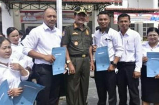METROBATAM.COM / Nias Barat – Bupati Nias Barat Khenoki Waruwu menyerahkan Surat Keputusan (SK) Pengangkatan 504 orang Guru menjadi Pegawai Pemerintah dengan Perjanjian Kerja (P3K) di lingkungan Pemerintah Kabupaten Nias Barat. Penyerahan SK tersebut dilaksanakan di halaman Kantor Bupati Nias Barat. Jumat, (24/06/2022).