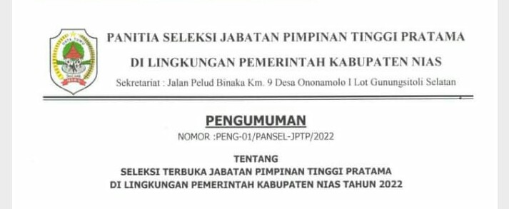 Tampak pada surat pengumuman tersebut ditandatangani oleh Sekretaris Daerah Kabupaten Nias, Samson Perdamaian Zai, SH.,MH selaku panitia seleksi jabatan Pimpinan tinggi Pratama Pemerintah Kabupaten Nias.