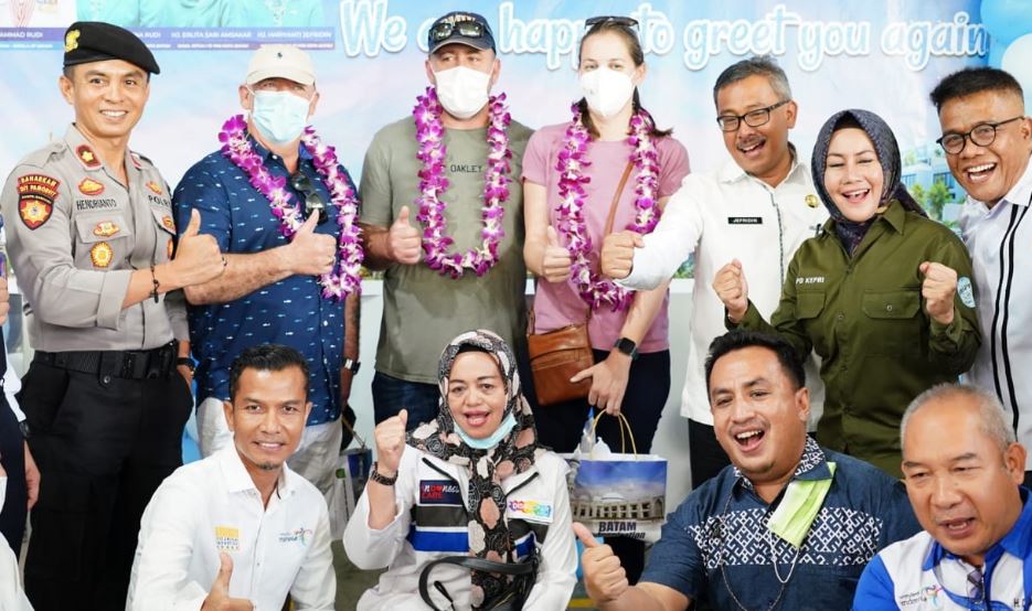 Anderson John, Aron, dan Catty, tiga pelancong dari Australia yang turun dari kapal feri tersebut, dikalungkan bunga oleh Sekretaris Daerah (Sekda) Kota Batam, Jefridin, didampingi Kepala Dinas Kebudayaan dan Pariwisata (Disbudpar) Kota Batam, Ardiwinata, sebagai bentuk penyambutan.