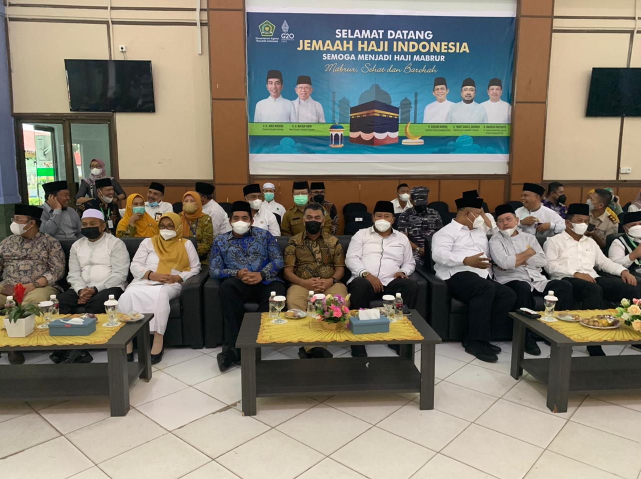METROBATAM.COM, Natuna- Bupati Natuna, Wan Siswandi bersama Ketua TP PKK Natuna, Septi Dwiani Siswandi sambut kedatangan 40 jamaah haji asal Natuna, Selasa, 26 Juli 2022 di Asrama Haji Batam.
