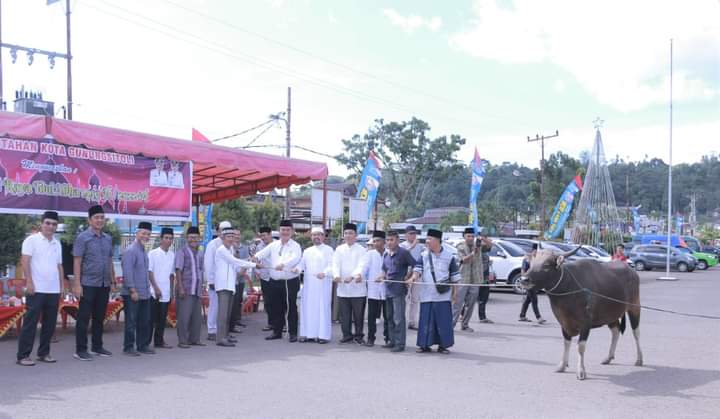 Dijelaskannya, 1 (satu) ekor sapi di serahan di Masjid AN-NUR Desa Boe Teluk Belukar, Gunungsitoli Utara, selanjutnya 1 (satu) ekor sapi diserahkan di Masjid AL-IMAN Desa Fowa, Gunungsitoli Idanoi, dan 2 (dua) ekor hewan Qurban disembelih di Halaman Kantor Wali Kota Gunungsitoli untuk masyarakat Muslim yang berada di Kecamatan Gunungsitoli Selatan dan Kecamatan Gunungsitoli. Penyembelih hewan Qurban dalam hal ini adalah Ketua MUI Kota Gunungsitoli.
