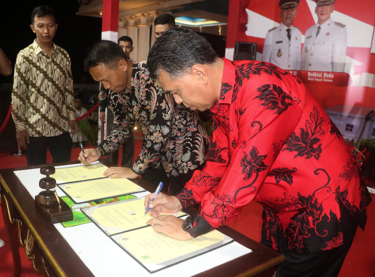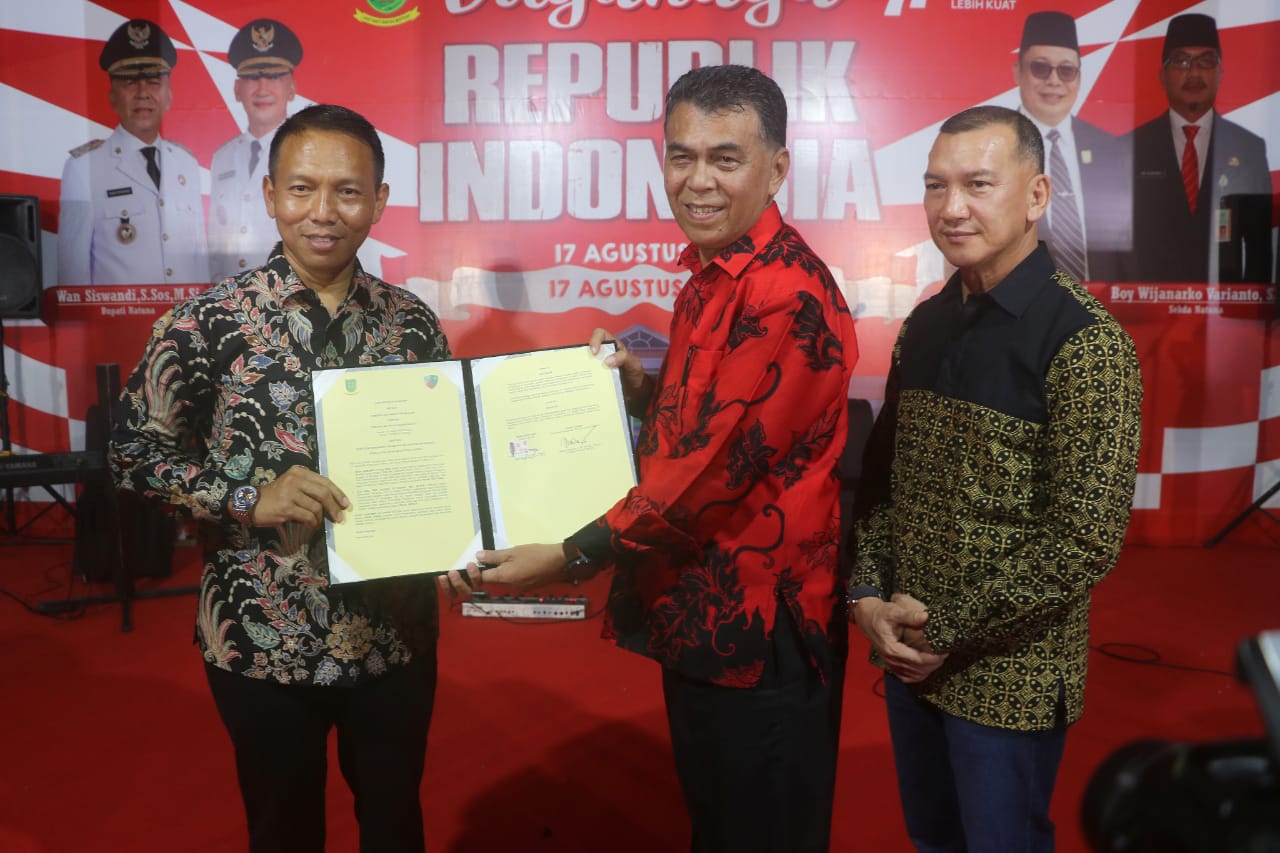 METROBATAM.COM, NATUNA- Bertepatan pada tanggal 17 Agustus 2022 acara malam silaturahmi Resepsi Kenegaraan HUT ke-77 Kemerdekaan Republik Indonesia(RI), di Halaman Gedung Daerah Natuna, Jalan Batu Sisir Bukit Arai, Pemerintah Kabupaten Natuna melaksanakan penandatanganan perjanjian kerja sama Tentang Bantuan Pengangkutan Bahan Bacaan Dalam Rangka Penguatan Gerakan Literasi Nasional bersama Pangkalan TNI AU Raden Sadjad(Lanud RSA) Ranai Natuna, Provinsi Kepulauan Riau, Rabu(17/8/2022) malam.