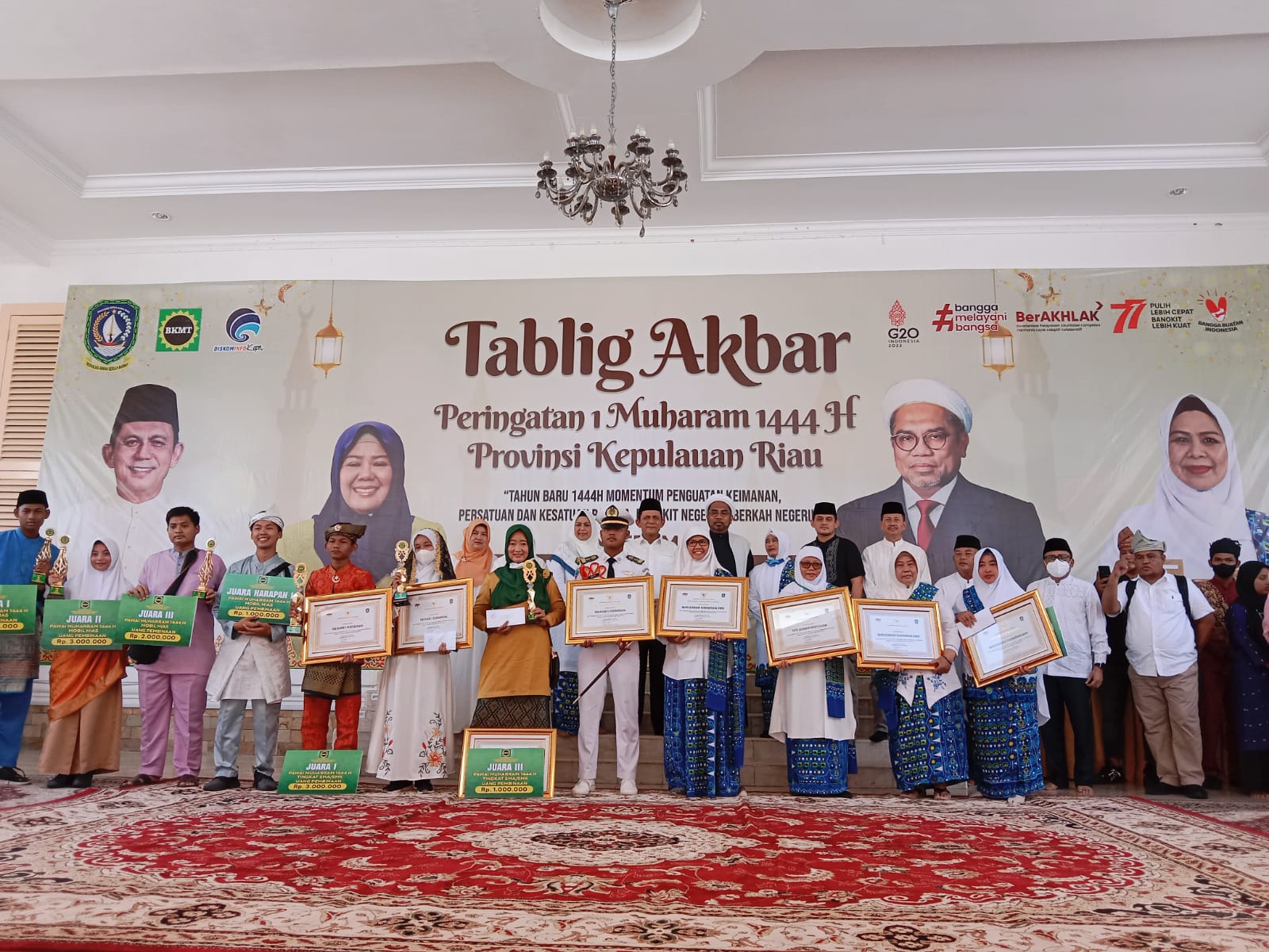 Gubernur Kepulauan Riau H. Ansar Ahmad bersama Ketua BMKT Provinsi Kepulauan Riau Hj. Dewi Kumalasari Ansar duduk bersama masyarakat yang lainnya menghadiri peringatan Tahun Baru Islam 1444 Hijriah. Pembukaan acara Tablig Akbar di tandai dengan lantunan ayat suci Alquran yang dibacakan oleh qori di Gedung Daerah Provinsi Kepulauan Riau, Tanjungpinang, Minggu (31/07).