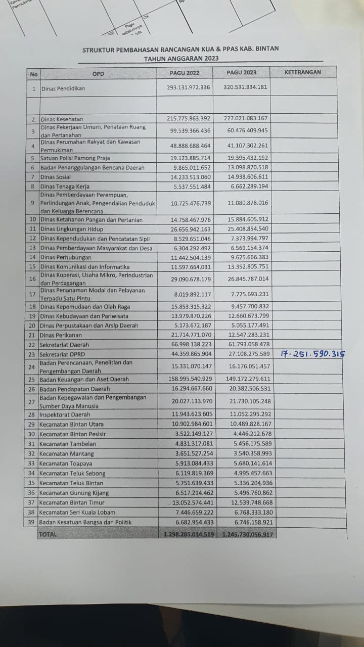 Sebelumnya, Anggota Badan Anggaran (Banggar) Dewan Perwakilan Rakyat Daerah (DPRD) Kabupaten Bintan, Tarmizi menyesalkan penurunan anggaran yang diberikan untuk Sekertariat DPRD Bintan, dibandingkan tahun 2021 lalu.