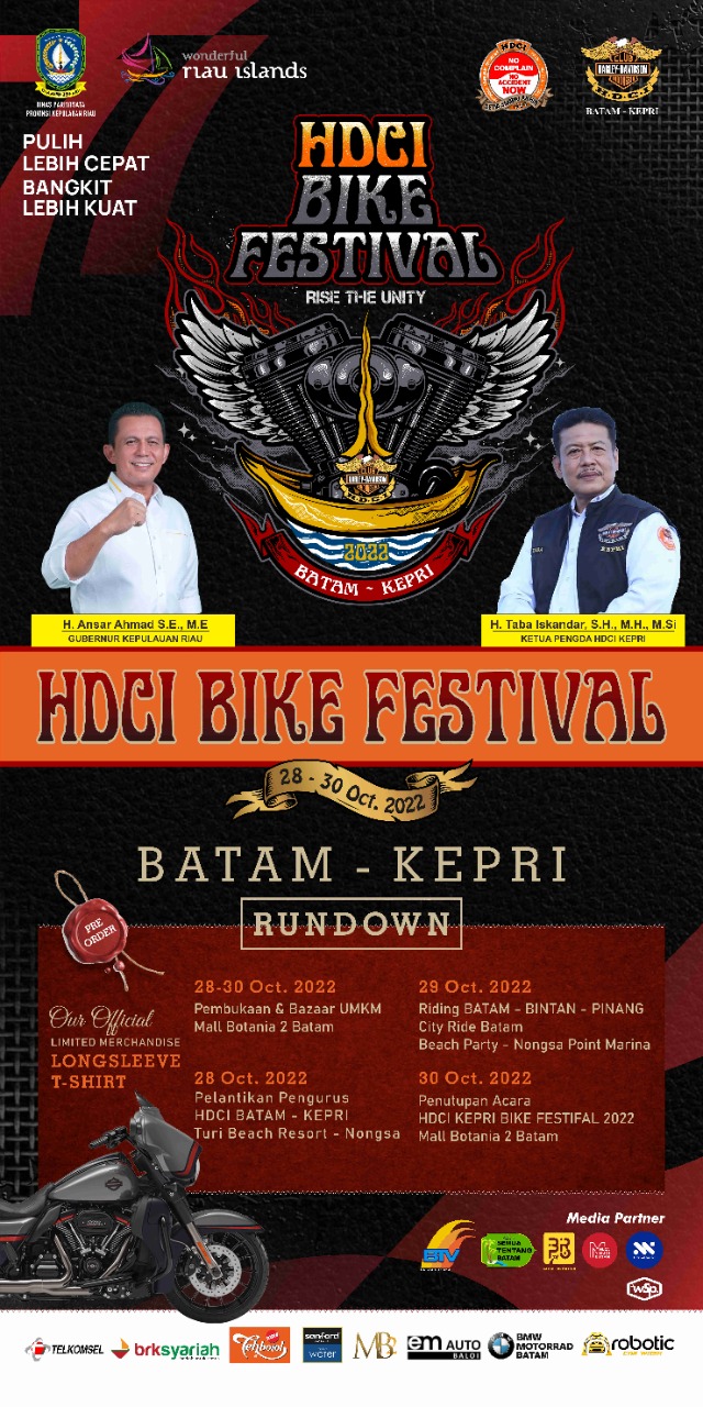 Metrobatam.com|Tanjungpinang- Event Harley-Davidson Club Indonesia (HDCI) Kepri Bike Festival 2022 yang akan digelar di Mall Botania 2 pada 28 sampai 30 Oktober 2022 besok dipastikan akan diikuti oleh puluhan Bikers. Mereka akan turut serta dalam touring mengelilingi destinasi risata yang ada di Batam-Bintan- Tanjungpinang sebagai rangkaian event.
