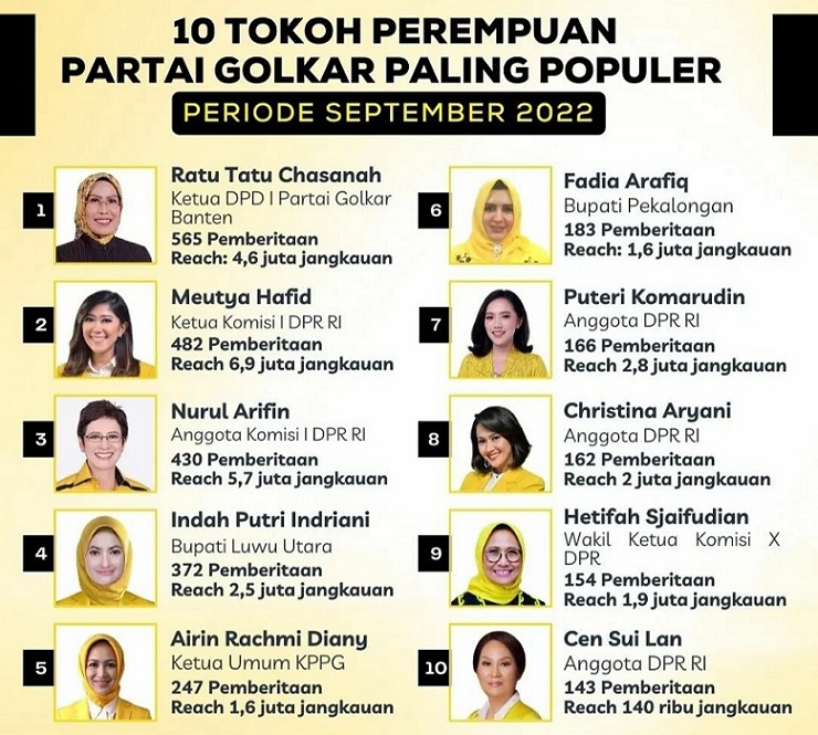 Golkarpedia.com menggunakan indikator pemberitaan bulan September 2022, untuk mengukur popularitas para politisi perempuan ini. Semakin banyak pemberitaan yang tercatat menulis namanya atau mengulas mengenai dirinya, maka semakin populer lah politisi perempuan ini.