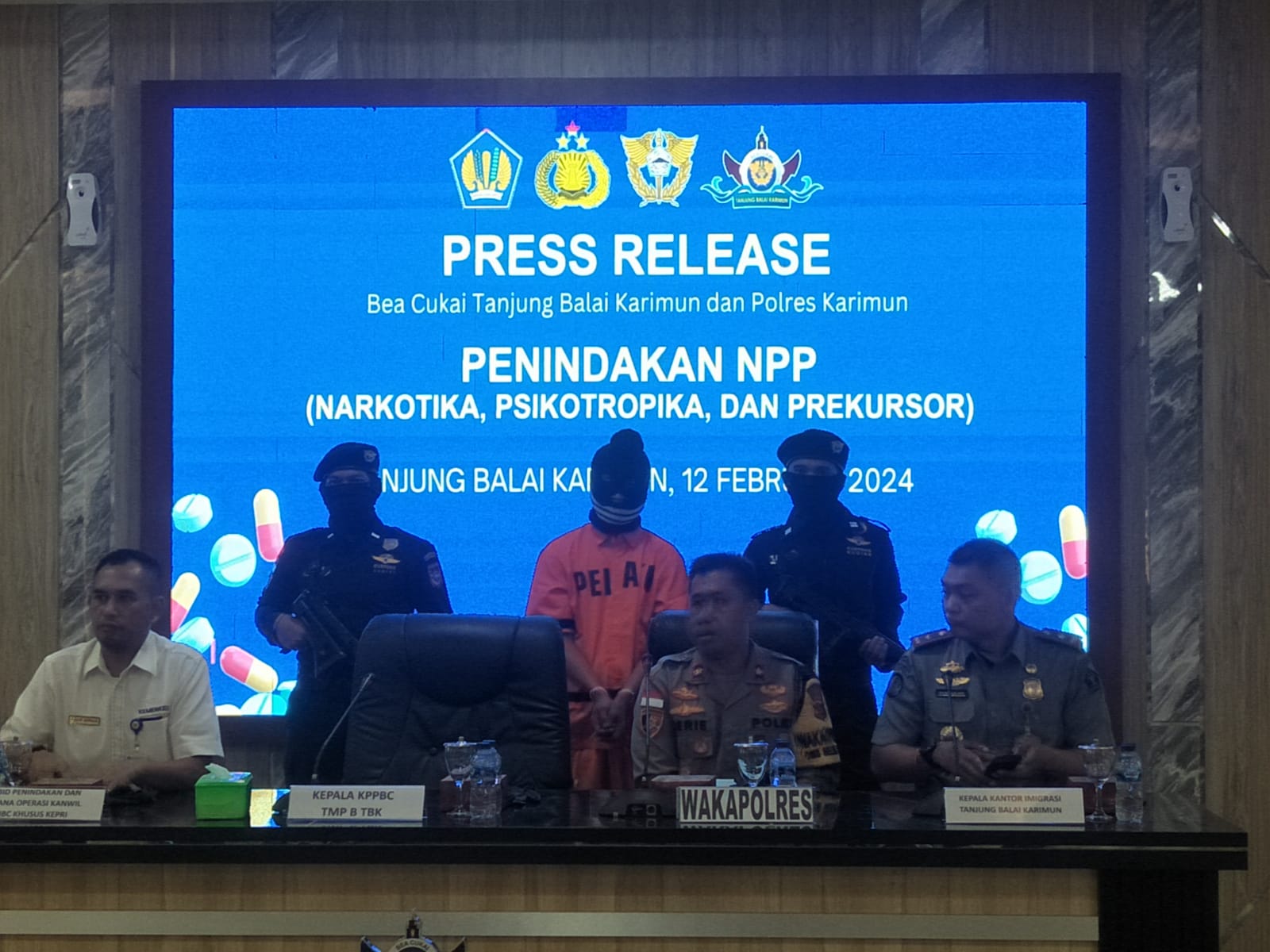 Kepala Kantor Pelayanan Pabean, Cukai, dan Bea Cukai (KPPBC) Tanjung Balai Karimun, Jerry Kurniawan, mengumumkan keberhasilan petugas dalam menggagalkan upaya penyelundupan narkoba di wilayah Kabupaten Karimun. Saat mengadakan pres rilisnya di Polres Karimun pada Senin, 12 Februari 2024.