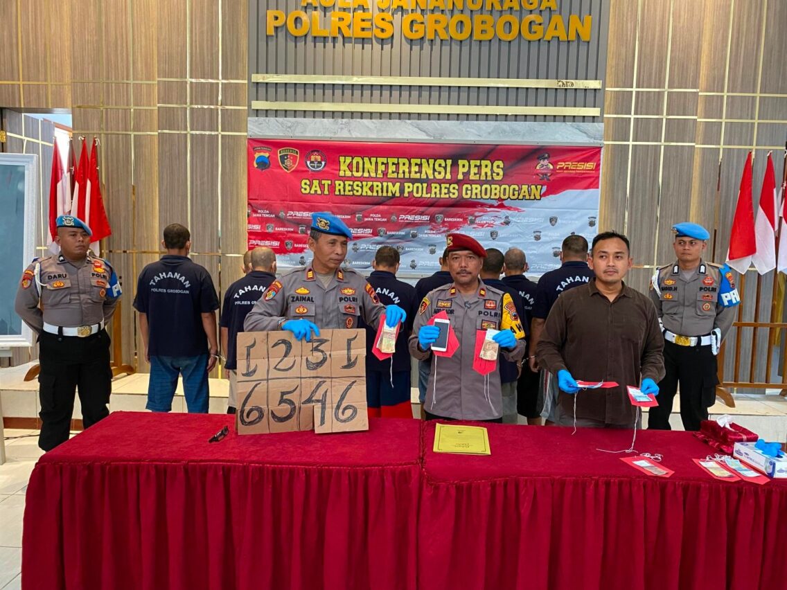 Personel Resmob Polres Grobogan berhasil menangkap 9 orang laki-laki yang sedang asyik melakukan perjudian jenis dadu menggunakan aplikasi ‘dice’ di sebuah ponsel milik pelaku. Sembilan pelaku tersebut yakni EP (43), IS (39), TM (46), TG (39), M (48), Ms (58), H (47) dan S (48) yang merupakan warga Kecamatan Purwodadi Kabupaten Grobogan. Sedangkan satu pelaku yakni Mj (61) merupakan warga Desa Temon Kecamatan Brati Kabupaten Grobogan.