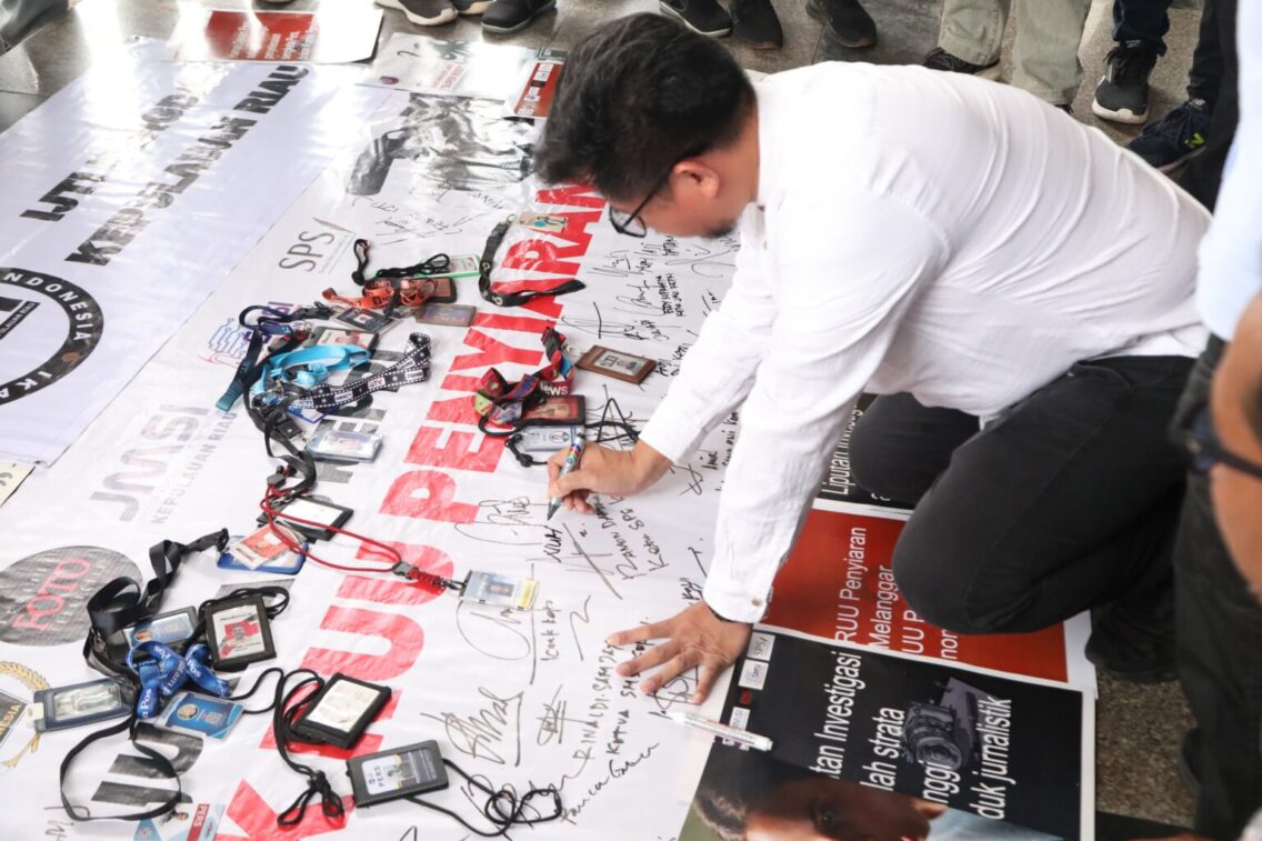 METROBATAM.COM, BATAM – Ketua DPRD Kota Batam Nuryanto SH MH ikut membubuhkan tanda tangan pada spanduk penolakan Revisi Rancangan Undang-Undang (RUU) Penyiaran di depan kantor DPRD Kota Batam, Senin (27/5/2024).