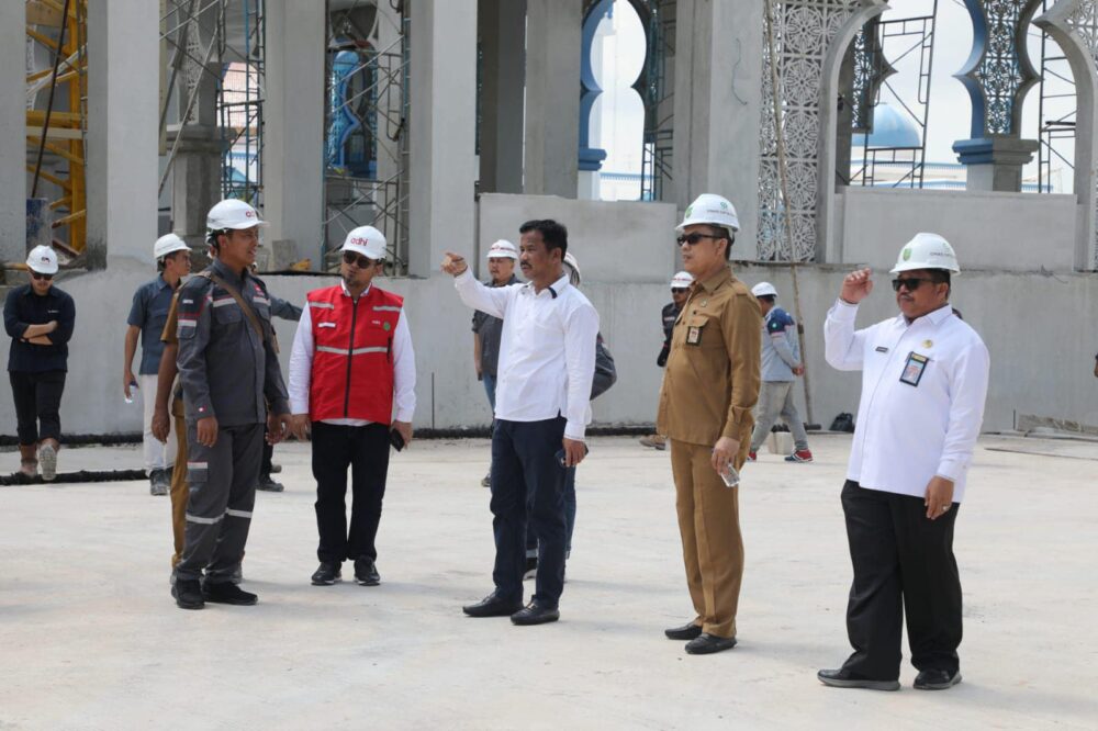 Rudi yang didampingi GM PT Adhi Karya (Persero) Tbk, Bagus Prima Anugerah, meninjau bagian ruang utama masjid hingga ke bagian pelantar.
