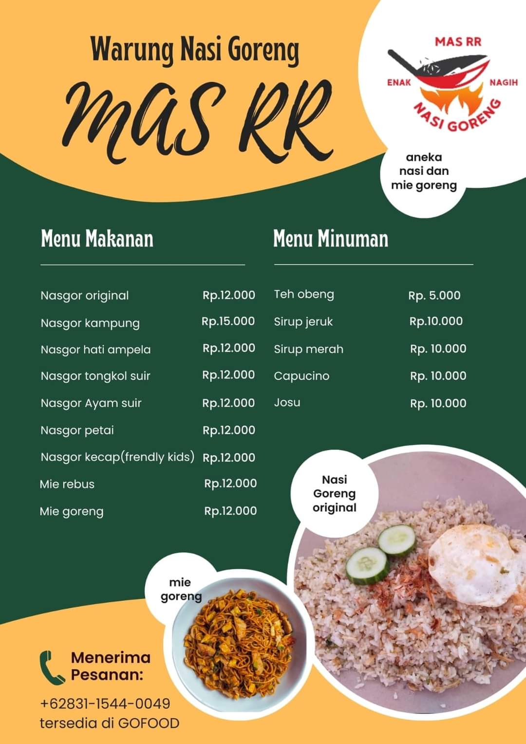 Adapun pilihan rasa yang tawarkan oleh Nasgor Mas RR ada Nasi Goreng Kampung, Nasi Goreng Hati Ampela, Nasi Goreng Ayam, Nasi Goreng Tongkol Suwir, Nasgor Petai, Nasgor Kecap, Mie Rebus dan Mie Goreng semuanya dapat dinikmati dengan harga Rp 12 Ribu saja.