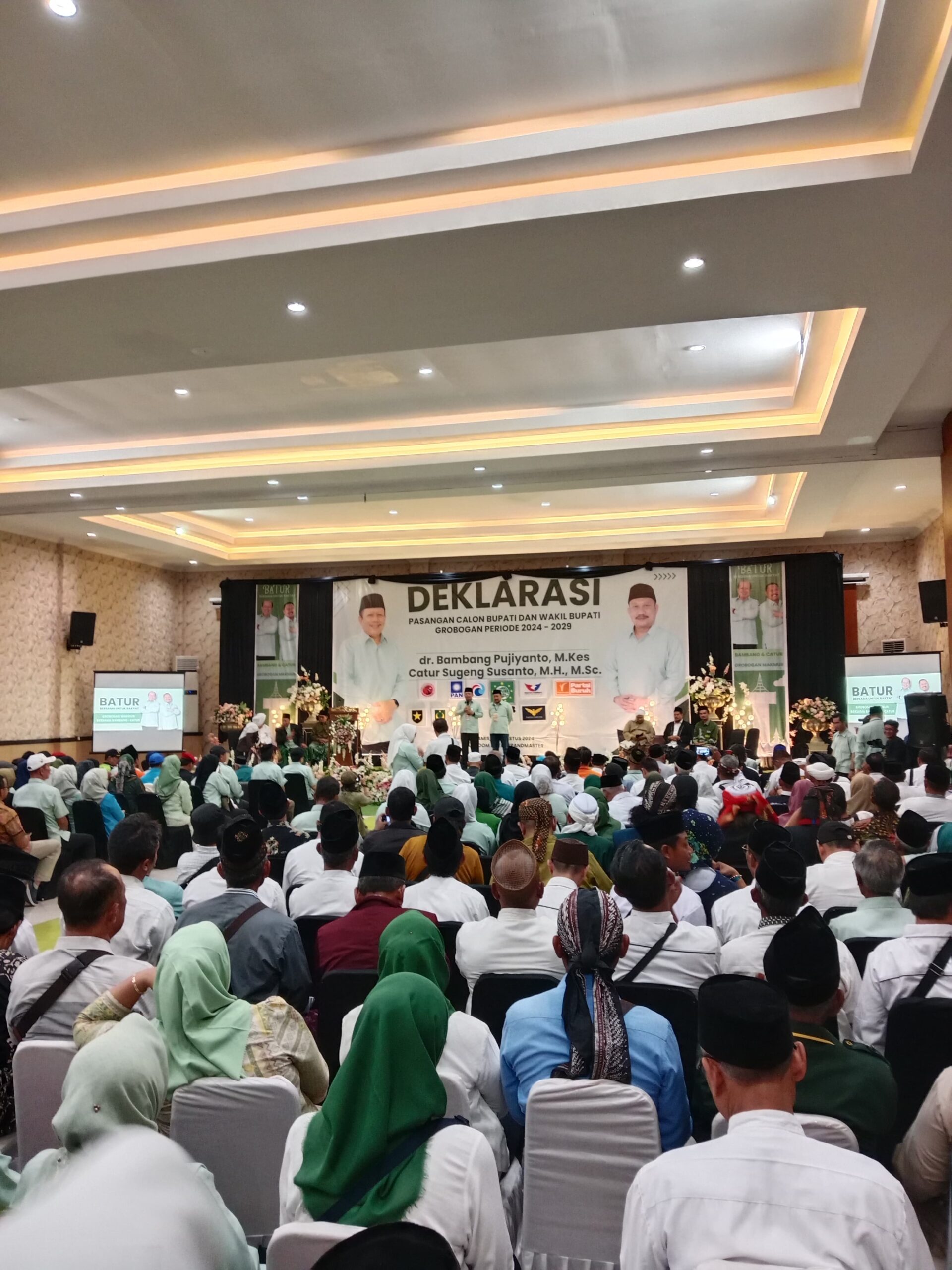 Metrobatam.com – Grobogan – Ribuan relawan, simpatisan dan pendukung bakal calon Bupati dan Wakil Bupati Grobogan berkumpul di halaman Hotel Kriyad Purwodadi, pada Kamis (29/08/2024), ribuan simpatisan tersebut berkumpul dalam rangka Deklarasi Pasangan Bambang- Catur, selanjutnya akan ikut mengantar pasangan calon Bupati dan Wakil Bupati Grobogan Bambang Pujiyanto dan Catur Sugeng Susanto untuk mendaftar ke KPU Grobogan.