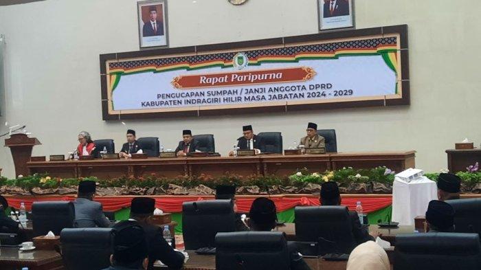 Prosesi pengucapan sumpah dan janji jabatan anggota DPRD Inhil di pimpin langsung oleh Ketua Pengadilan Negeri (PN) Aurora Quintina disaksikan langsung Pj Bupati Inhil Erisman Yahya, Pj Gubernur Riau yang di wakili Kepala Dinas Penanaman Modal dan Pelayanan Satu Pintu Helmi D serta Sekwan Indra Yevi Rais.