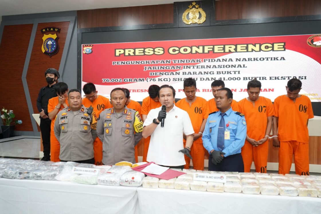 METROBATAM.COM, PEKANBARU – Ditres Narkoba Polda Riau mengungkap peredaran narkoba internasional. Delapan orang tersangka diamankan dengan barang bukti sabu 76 Kg dan 41 ribu butir pil ekstasi senilai Rp88 miliar lebih.