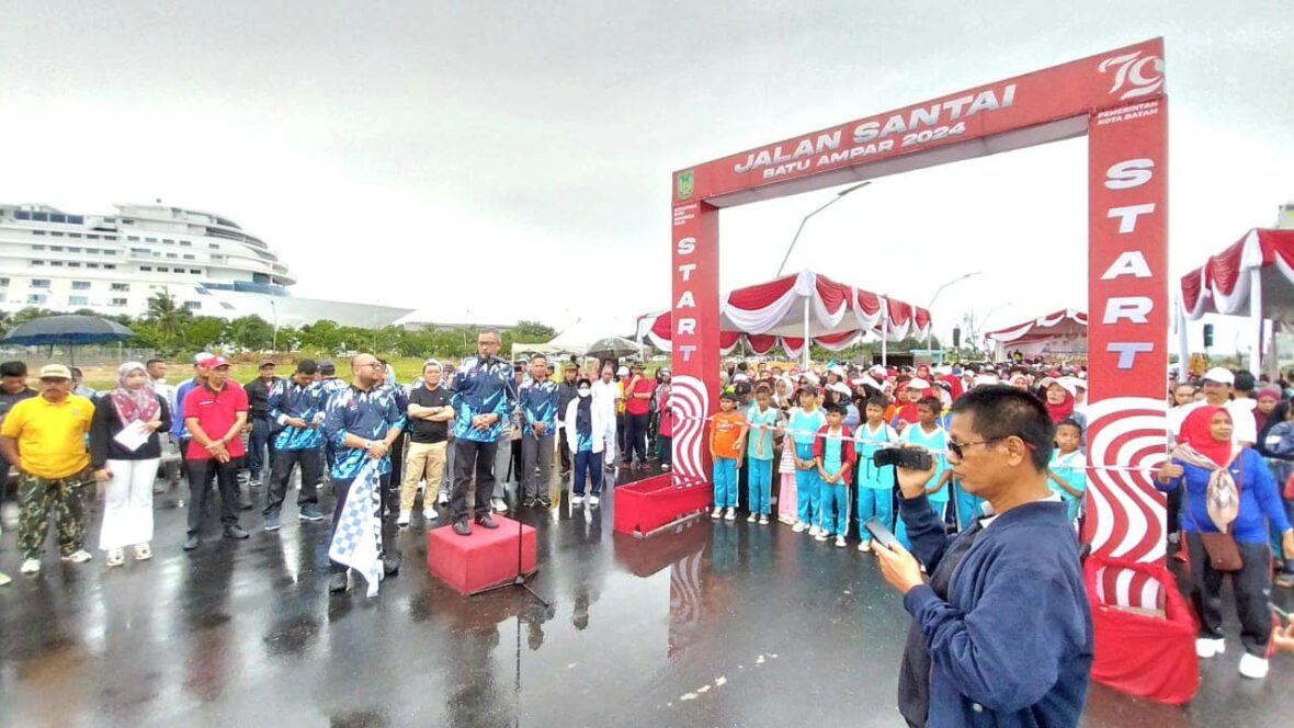 METROBATAM.COM, BATAM – Hujan tak menyurutkan semangat peserta gerak jalan santai Batu Ampar. Ribuan peserta gerak jalan santai Batuampar dilepas Wali Kota Batam, Muhammad Rudi diwakili Sekretaris Daerah Kota Batam, Jefridin, M.Pd. di Taman Pasific Palace Hotel, Sabtu (14/09/2024).
