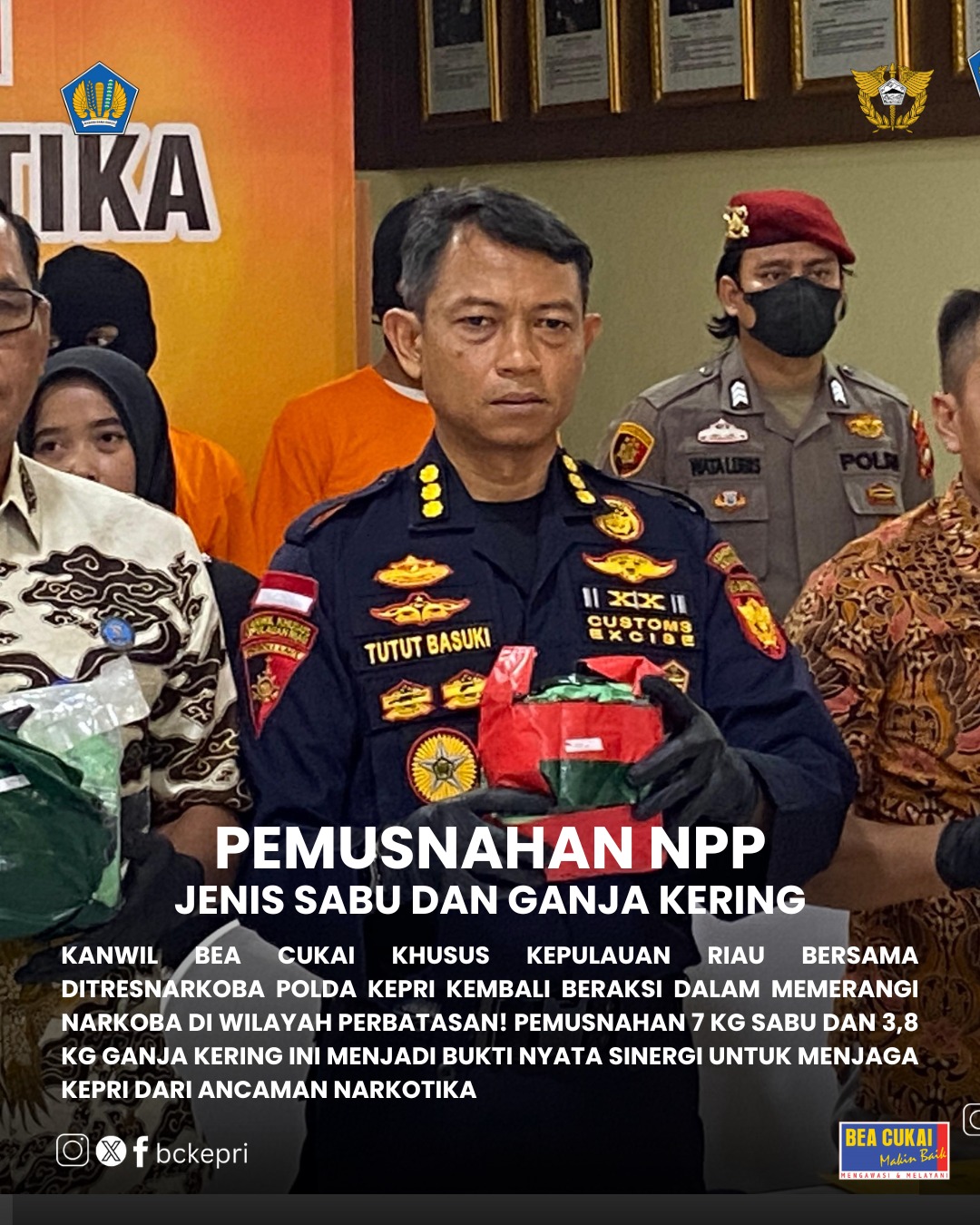 Kanwil Bea Cukai Khusus Kepulauan Riau yang diwakili oleh Tutut Basuki selaku Kepala Bidang Penindakan dan Sarana Operasi, menghadiri konferensi pers terkait pemusnahan barang bukti Narkotika yang digelar oleh Direktorat Reserse Narkoba ( Ditresnarkoba ) Polda Kepulauan Riau.
