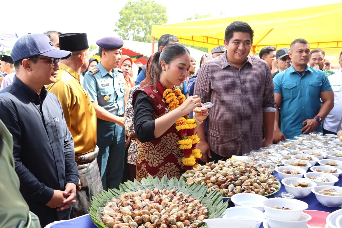 Disambut dengan taburan beras kunyit dan pencak silat melayu, Wamenpar kemudian langsung mencoba kuliner gonggong (siput cangkang) beserta sambal khasnya.