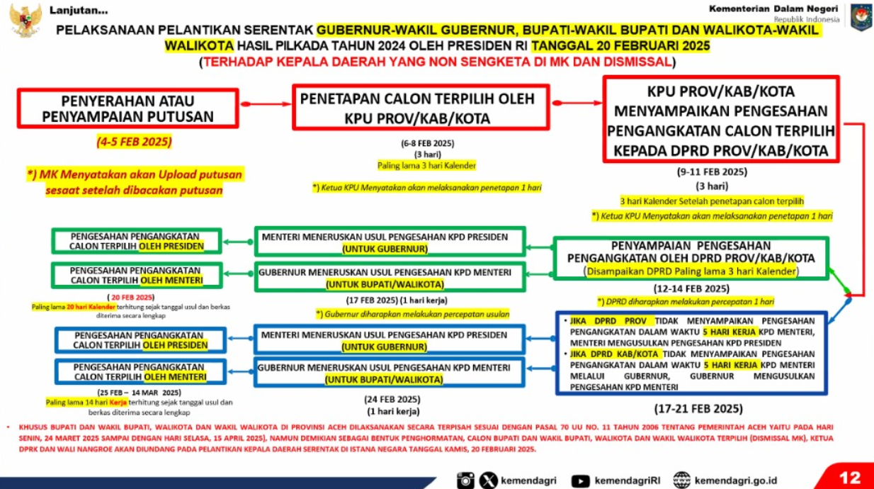 ‘’Tanggal 4-5 Februari MK akan menyampaikan putusan dismissal, 6-8 Februari KPU Prov/kab/kota akan menetapkan calon terpilih. 9-11 KPU akan menyampaikan calon terpilih ke DPRD. 3 hari kemudian, DPRD akan menyampikan pengesahan calon terpilih bupati/wabup/ walikota/wakil walikota ke gubernur untuk diteruskan ke Mendagri. Dan ke Presiden untuk gubernur/wakil gubernur untuk pengesahan pengangkatan calon terpilih (dismissal MK). Dan calon terpilih akan dilantik Presiden di Istana Negara, 20 Februari 2025,’’ terang Mendagri.