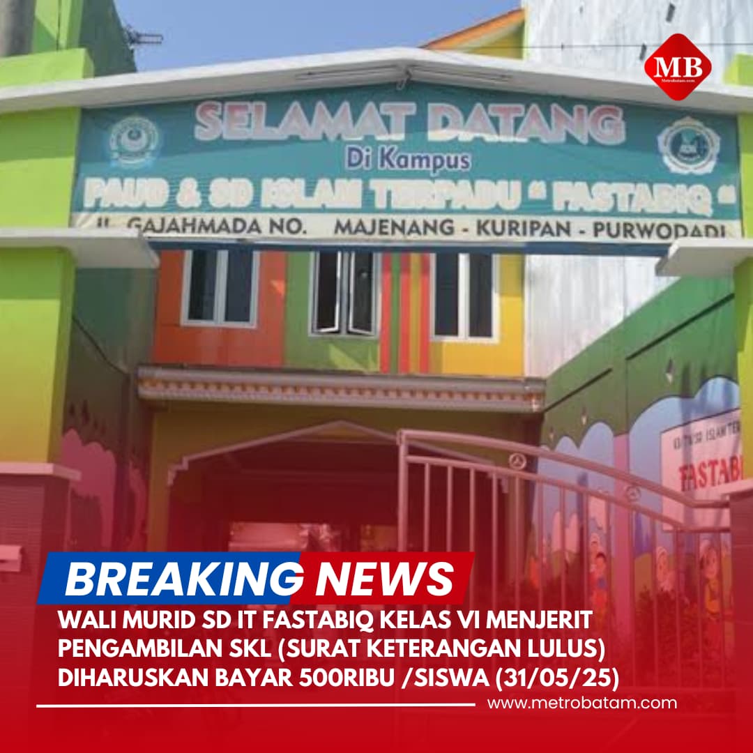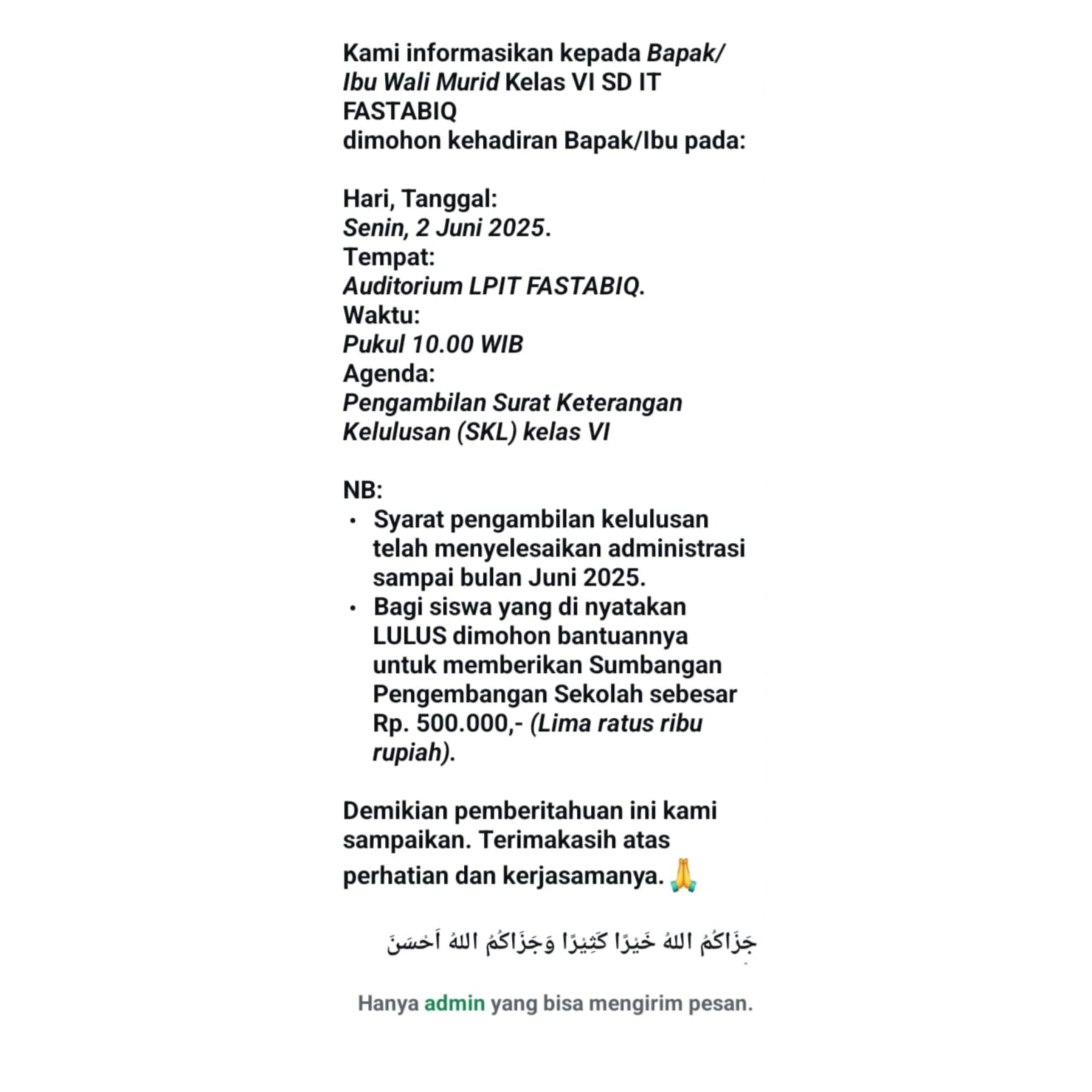 Metrobatam.com || Grobogan – Beredarnya surat pengumuan di Grub Wali Murid Kelas VI SD IT Fastabiq terkait biaya tarikan sumbangan pembangunan gedung sebesar Rp 500.000,- bagi siswa yang dinyatakan lulus menuai keresahan beberapa wali murid, Sabtu (31/05/25).