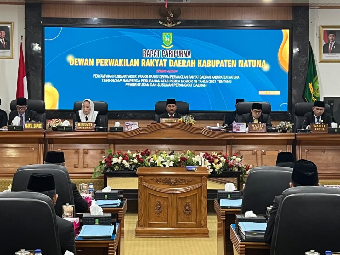 Rapat ini mengusung agenda penyampaian pendapat akhir Fraksi-Fraksi DPRD Kabupaten Natuna terhadap Ranperda Perubahan atas Perda Nomor 16 Tahun 2021 tentang Pembentukan dan Susunan Perangkat Daerah.
