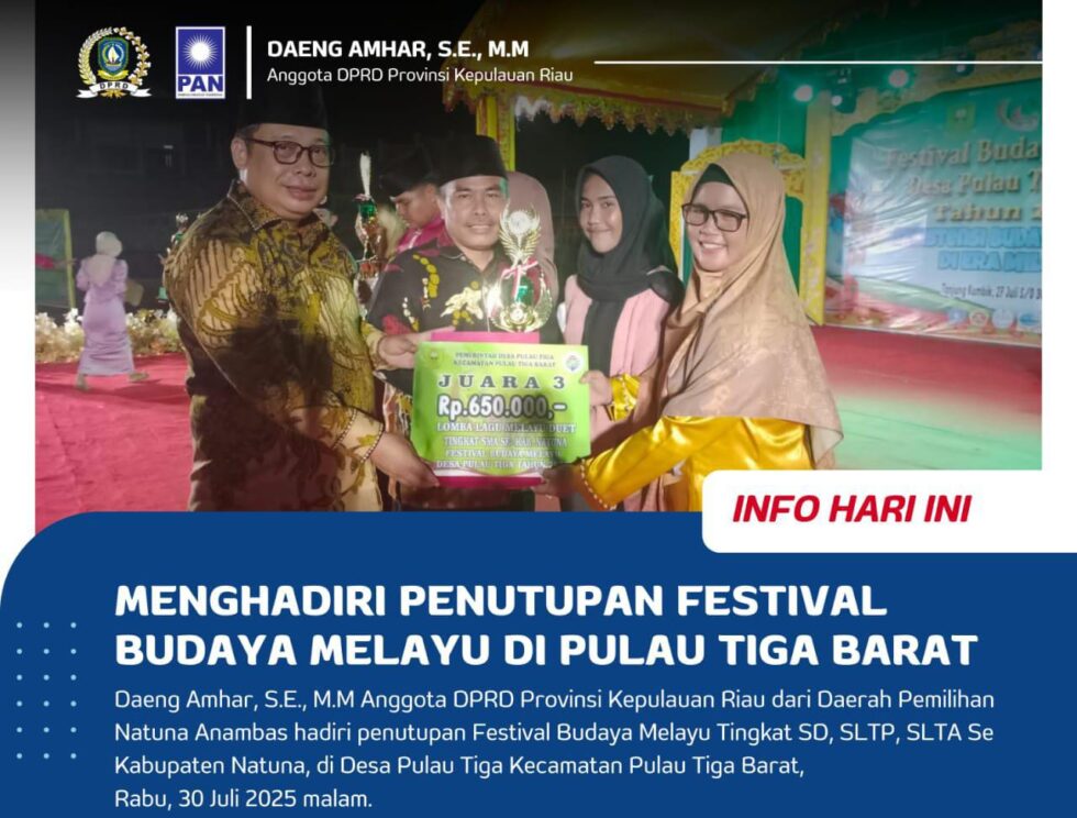 METROBATAM.COM, NATUNA — Anggota DPRD Provinsi Kepulauan Riau dari Dapil Natuna–Anambas, Daeng Amhar. SE.,MM menghadiri penutupan kegiatan Festival Budaya Melayu Tingkat SD, SLTP, dan SLTA se-Kabupaten Natuna yang digelar di Desa Pulau Tiga, Kecamatan Pulau Tiga Barat, Rabu (30/7/2025).