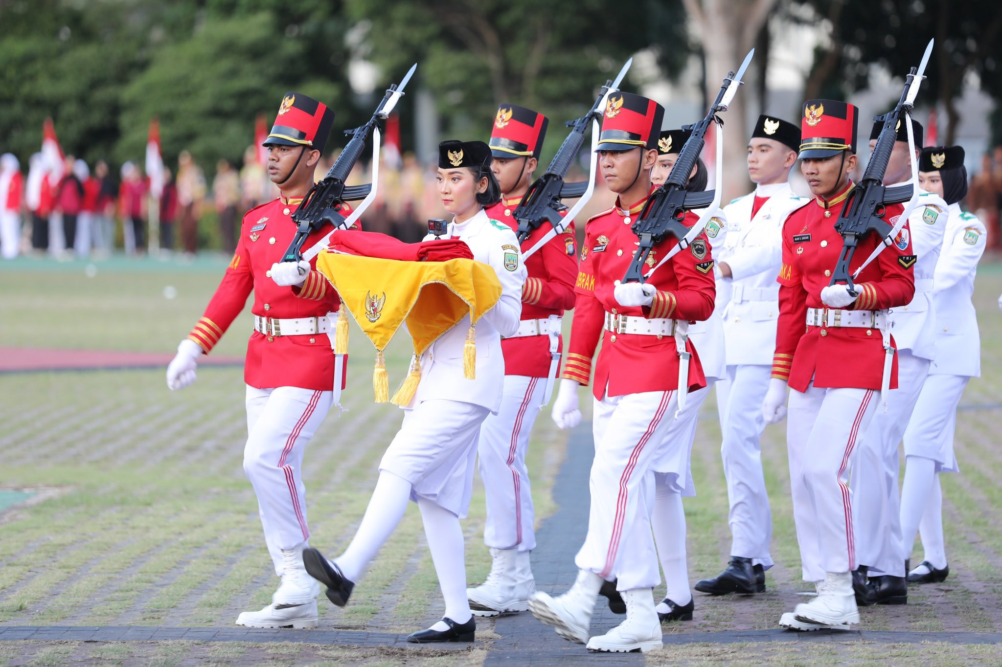 Petugas penurunan bendera antara lain Danpok 17 Achmad Vhicry Zikrillah Ariyanto, Pembawa Baki Dina Mariana, Cadangan Pembawa Baki Janet Priskilla Ferdi Tampubolon, Pelipat Bendera Muhamad Rafa Dimas Fardiawan, Danpok 8 Muhammad Luthfi Solahuddin Al Azzami, serta Penggerek Bendera Muhammad Azam Satria.