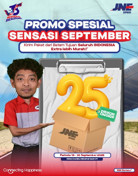 BATAM, METROBATAM.COM — Di bulan September 2025, JNE menghadirkan promo spesial bertajuk “Sensasi September” yang menawarkan potongan harga ongkos kirim hingga 25 persen.