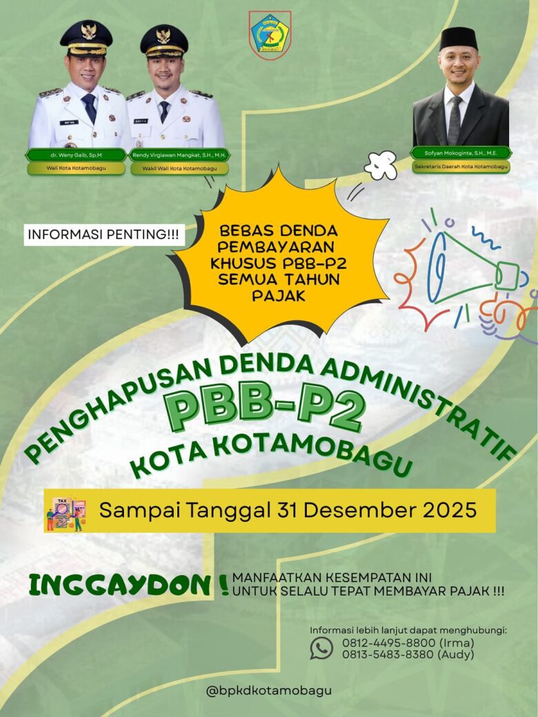 Kepala BPKD Kota Kotamobagu, Pra Sugiarto Hadi Yunus, S.P., M.E: mengatakan bahwa Pemerintah Daerah Kota Kotamobagu memberikan kesempatan kepada seluruh Wajib Pajak di Kota Kotamobagu, untuk melakukan pembayaran Pajak Bumi dan Bangunan tanpa dikenakan denda Administrasi.