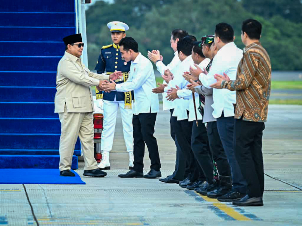 Ketibaan Presiden Prabowo di Indonesia disambut oleh Wakil Presiden Gibran Rakabuming, Menteri Koordinator Bidang Perekonomian Airlangga Hartarto, Menteri Sekretaris Negara Prasetyo Hadi, Menteri ESDM Bahlil Lahadalia, Menteri Pemuda dan Olahraga Erick Thohir, Wakil Menteri Komunikasi dan Digital Angga Raka Prabowo, Kepala BIN Muhammad Herindra, Panglima TNI Jenderal Agus Subiyanto, dan Wakapolri Komjen Dedi Prasetyo.