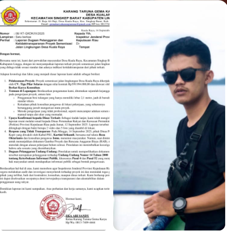 Pada hari ini, Selasa, 16 September 2025, Ketua Karang Taruna Gema Karya, Eka Arie Sandy, secara resmi melayangkan laporan kepada Inspektorat Jenderal Provinsi Kepulauan Riau.