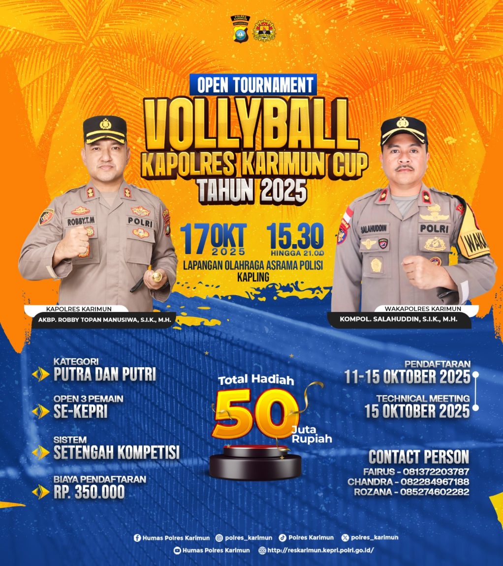 Mari sukseskan Open Tournament Vollyball Kapolres Karimun Cup Tahun 2025 dan jadikan olahraga sebagai sarana memperkuat solidaritas serta semangat kebersamaan di Kabupaten Karimun. (Af)