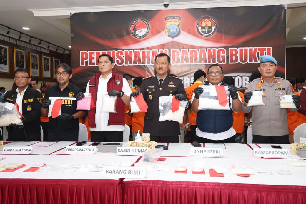 “Adapun total barang bukti yang disita dan dimusnahkan meliputi Sabu kristal/padat sebanyak 9.482,09 gram (9.110,93 gram untuk dimusnahkan, disisihkan untuk pembuktian 368,93 gram dan Labfor 2,23 gram), Serbuk ekstasi sebanyak 553,68 gram (530,18 gram untuk dimusnahkan, disisihkan untuk pembuktian 23,46 gram dan Labfor 0,04 gram), Ekstasi sebanyak 1299 butir (1.246 butir untuk dimusnahkan, disisihkan untuk pembuktian 43 butir dan Labfor 10 butir). Sebagian kecil barang bukti disisihkan untuk pembuktian di pengadilan dan pemeriksaan laboratorium forensik sesuai ketentuan yang berlaku,” jelas Dirresnarkoba Polda Kepri Kombes. Pol. Anggoro Wicaksono., S.H., S.I.K., M.H.,
