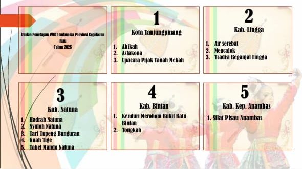 Dari 14 usulan WBTbI asal Provinsi Kepulauan Riau, Kabupaten Natuna tercatat sebagai penyumbang terbanyak dengan 5 WBTb yang berhasil lolos dan ditetapkan secara nasional.