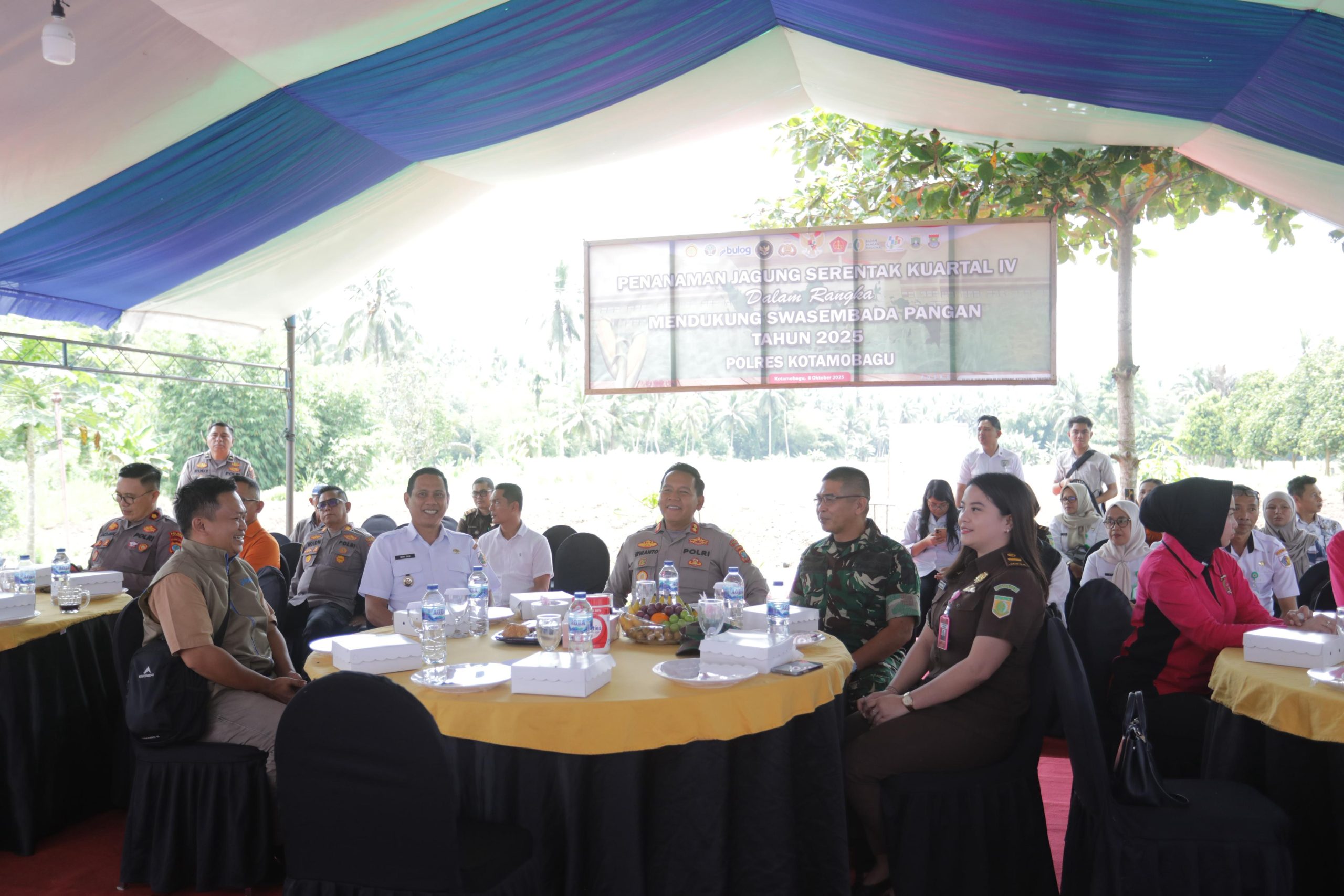 Penanaman Jagung Serentak Kuartal IV yang dilaksanakan Polres Kota Kotamobagu dalam rangka mendukung Swasembada Pangan Nasional Tahun 2025, dihadiri Kapolres Kotamobagu, AKBP Irwanto, S.I.K., M.H., Wakapolres Kotamobagu, Kompol. Romel Pontoh, S.I.P., M.A.P., Kasdim 1303 Bolaang Mongondow Mayor Arh. Achmad Janis, perwakilan Forkopimda Kota Kotamobagu, Kepala BPS Kota Kotamobagu Jasni Makalunsenge, S.E., M.Si., Kepala Perum Bulog Sub Divre Bolaang Mongondow Ismail Aziz, serta para pejabat di lingkungan Polres Kota Kotamobagu.