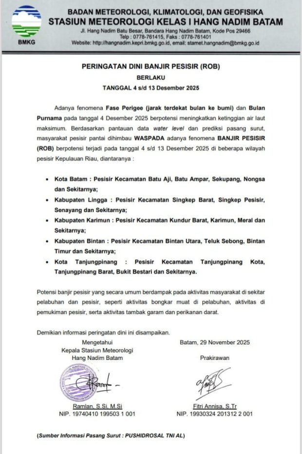 METROBATAM.COM, BATAM – Badan Meteorologi, Klimatologi, dan Geofisika (BMKG) mengeluarkan peringatan dini potensi banjir pesisir atau rob yang diperkirakan terjadi di wilayah Kepulauan Riau (Kepri) pada 4–13 Desember 2025.