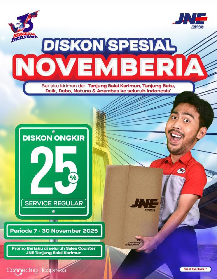 BATAM, METROBATAM.COM — Perusahaan jasa pengiriman terkemuka, JNE, kembali menghadirkan program promo menarik bagi pelanggannya di bulan November 2025. Bertajuk “NOVEMBERIA”, promo ini menawarkan potongan biaya kirim sebesar 25 persen untuk pengiriman dari sejumlah wilayah di Kepulauan Riau ke seluruh Indonesia.
