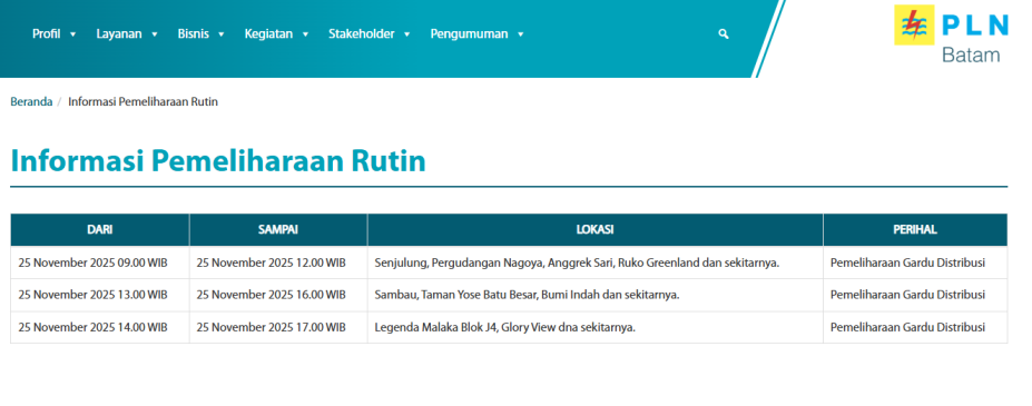 BATAM, METROBATAM.COM – Dalam website resminya, PT PLN Batam merilis informasi pemeliharaan rutin yang bisa berdampak pada pemadaman listrik di kota Batam, Selasa 25 November 2025.