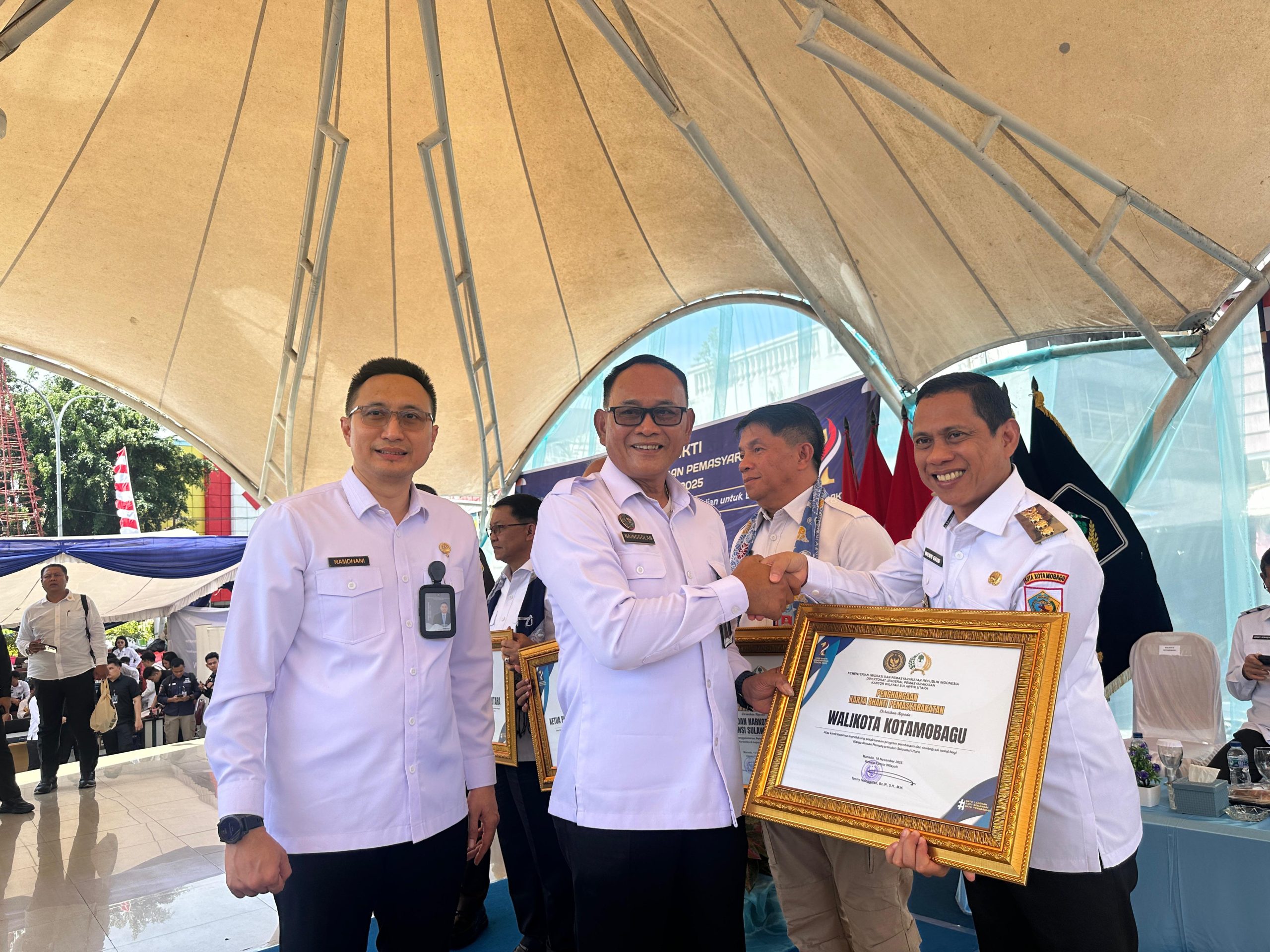 Pada kesempatan tersebut, Wali Kota Kotamobagu, dr. Weny Gaib, Sp.M., juga menerima Penghargaan Karya Bhakti Pemasyarakatan dari Kementerian Imigrasi dan Pemasyarakatan Republik Indonesia Direktorat Jenderal Kantor Wilayah Sulawesi Utara, atas Kontribusinya mendukung pelaksanaan program Pembinaan dan Reintegrasi Sosial bagi Warga Binaan Pemasyarakatan Sulawesi Utara, yang diserahkan Kepala Kantor Wilayah Direktorat Pemasyarakatan Sulawesi Utara, Tonny Nainggolan., Bc.IP., S.H., M.H.