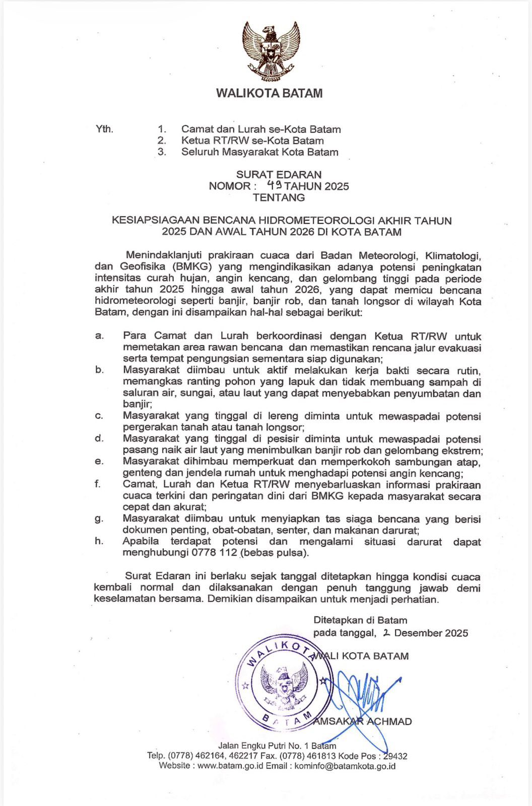 Imbauan tersebut disampaikan setelah Pemerintah Kota Batam menerbitkan Surat Edaran Nomor 49 Tahun 2025 tentang Kesiapsiagaan Bencana Hidrometeorologi.