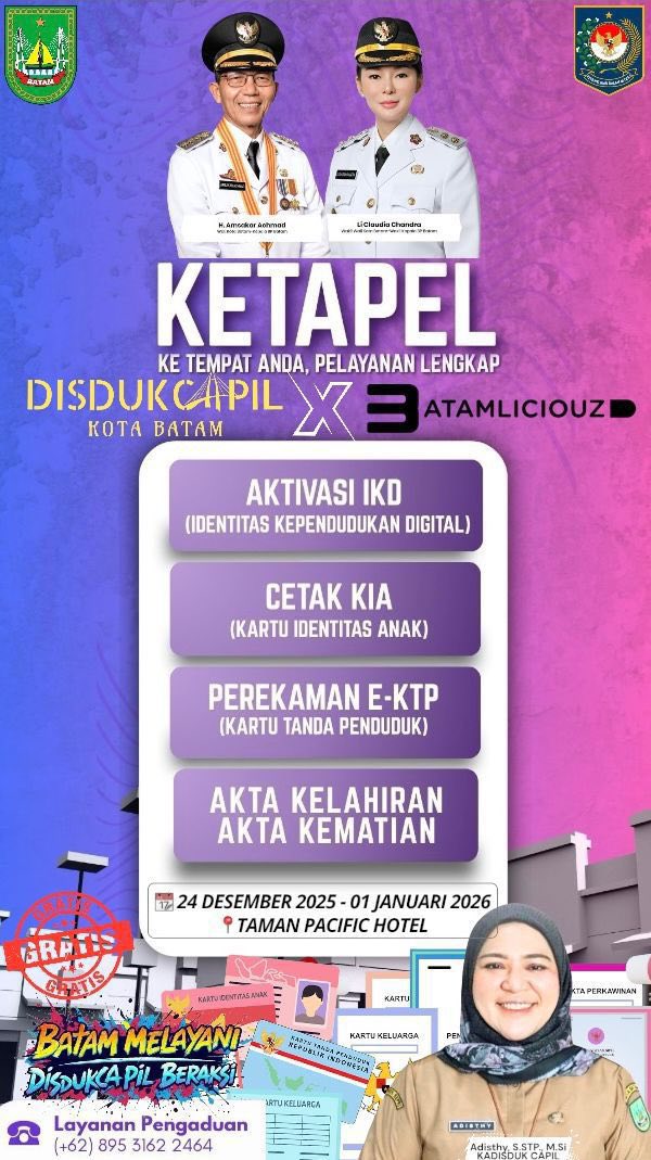 “Melalui KETAPEL, kami tidak menunggu warga datang ke kantor, tetapi justru hadir langsung di lokasi yang mudah dijangkau. Ini merupakan komitmen Disdukcapil untuk memberikan pelayanan yang cepat, mudah, dan gratis bagi seluruh masyarakat Batam,” ujar Adhisty.
