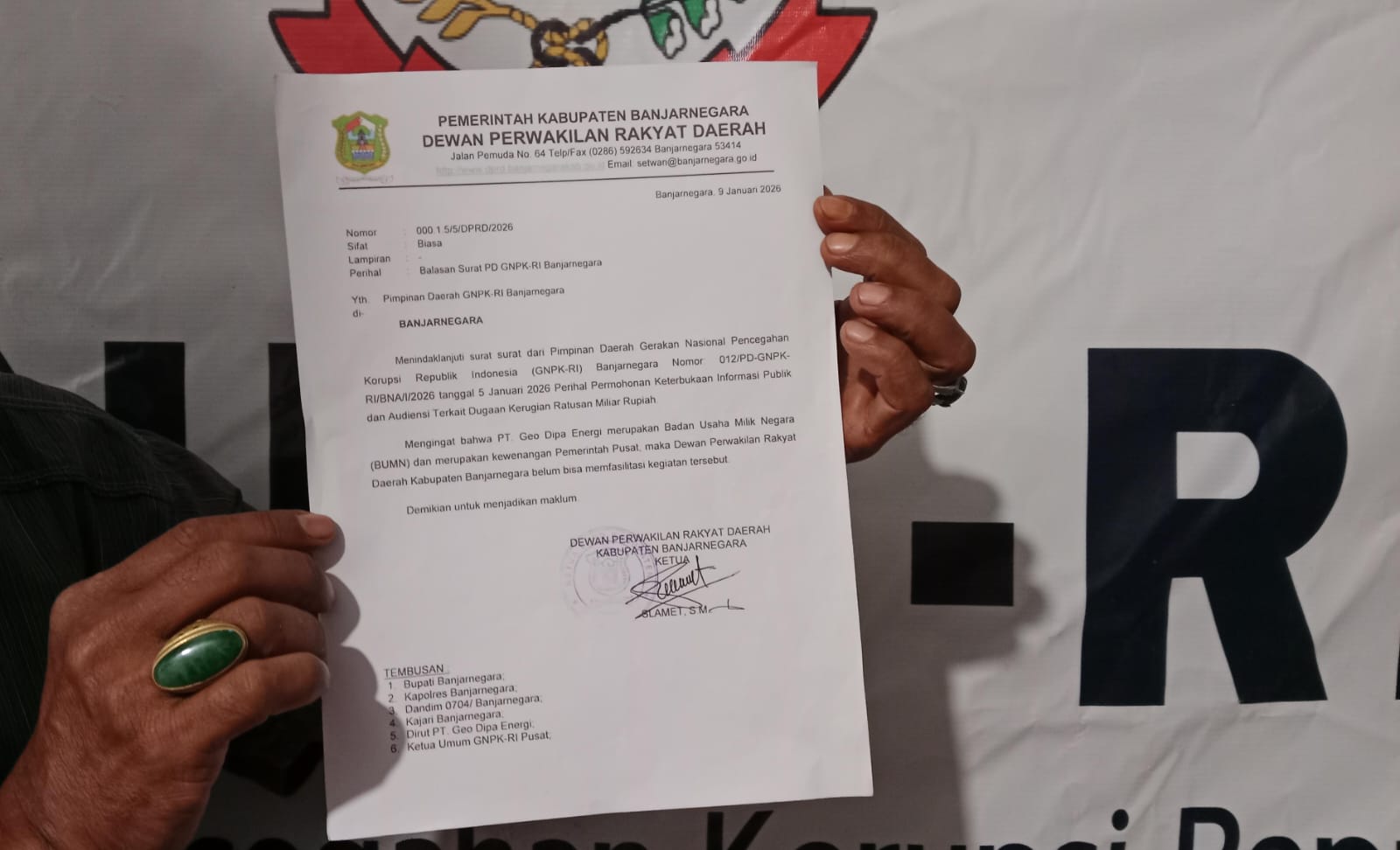 Penolakan tersebut tertuang dalam surat balasan dari DPRD Banjarnegara yang ditandatangani langsung oleh Ketua DPRD Slamet dan diterima oleh PD GNPK-RI Banjarnegara pada Jumat, 9 Januari 2026.