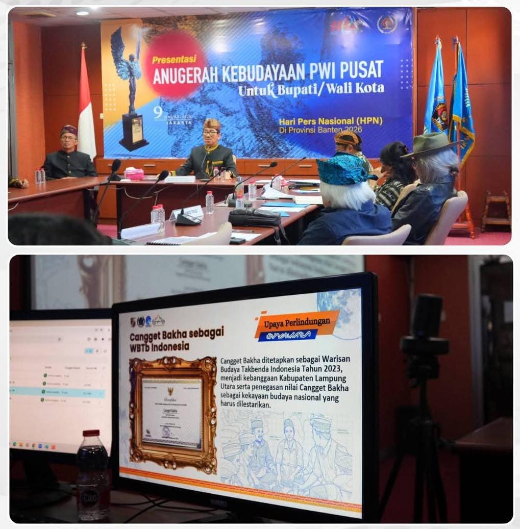 Proses penjurian berlangsung di hadapan dewan juri yang terdiri dari unsur PWI Pusat, akademisi, serta praktisi budaya nasional. Dalam pemaparannya, Bupati menegaskan komitmen Pemerintah Kabupaten Lampung Utara dalam pelestarian budaya melalui pembinaan sanggar seni, pendokumentasian budaya daerah, hingga upaya regenerasi pelaku seni agar kesenian tradisional tetap relevan dan diminati oleh generasi muda.
