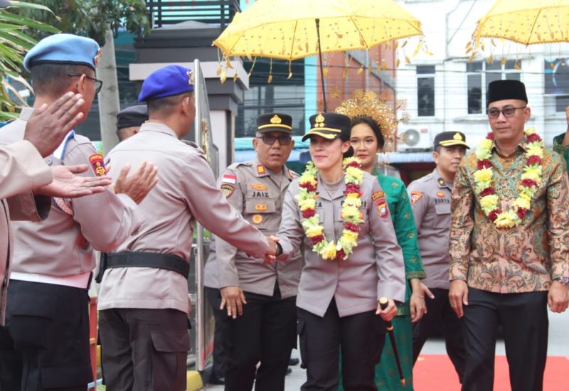 Selanjutnya, Kapolres mengikuti tradisi penyambutan di Mapolres Karimun berupa pemayungan, pengalungan bunga oleh Pocil, serta penyambutan personel Polres Karimun.