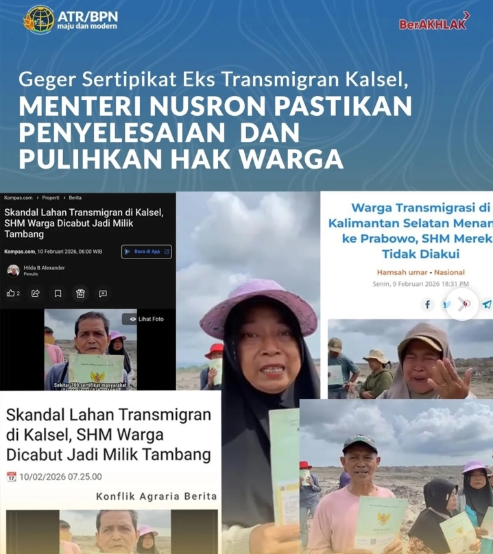 METROBATAM.COM|KALSEL- Menteri Agraria dan Tata Ruang/Kepala Badan Pertanahan Nasional (ATR/BPN), Nusron Wahid, menindaklanjuti persoalan pembatalan sertipikat tanah milik masyarakat transmigran di Desa Bekambit dan Desa Bekambit Asri, Kabupaten Kotabaru, Kalimantan Selatan.