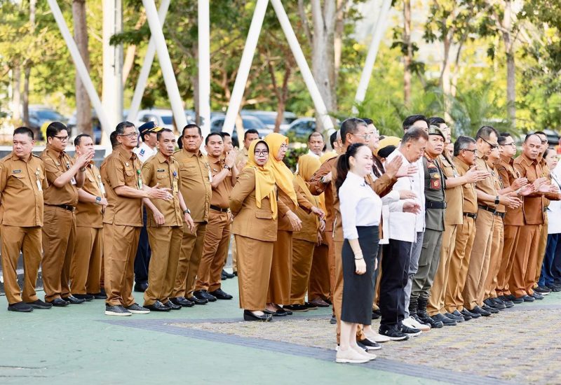 METROBATAM.COM, BATAM — Wali Kota Batam, Amsakar Achmad, memimpin Apel Gabungan Pemerintah Kota (Pemko) Batam dan Badan Pengusahaan (BP) Batam di Dataran Engku Putri, Kantor Wali Kota Batam, Senin (9/2/2026). Turut hadir, Wakil Wali Kota Batam, Li Claudia Chandra.