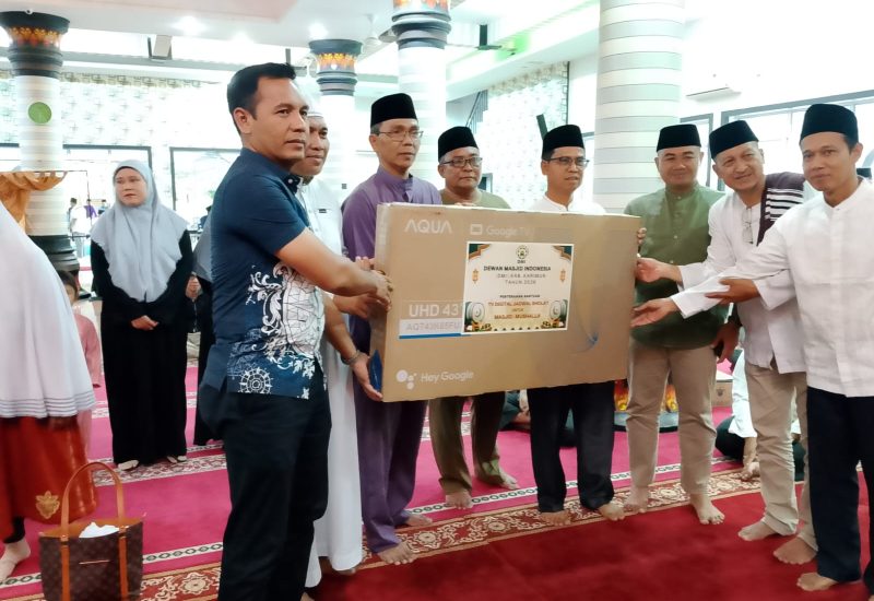 Bupati Iskandarsyah menyerahkan bantuan satu unit TV digital, juga menyerahkan bantuan untuk petugas Masjid Darul Jannah.